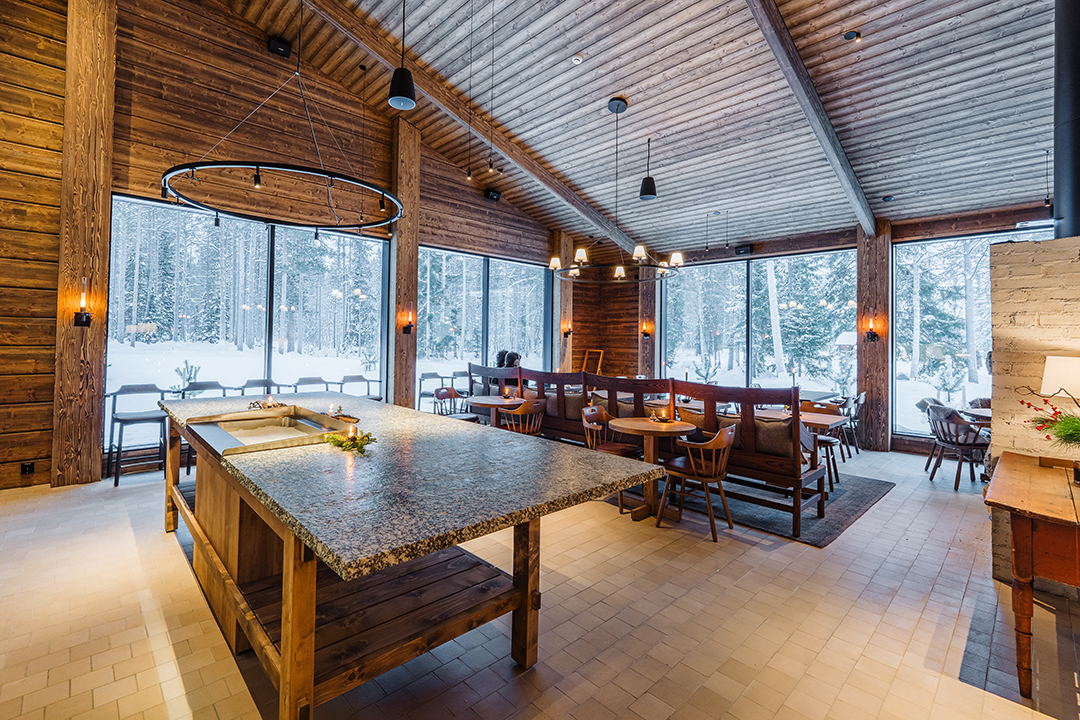 Ravintolan sijoittuminen, tilojen avoimuus ja näkyvyys vaikuttivat suoraan hirsirakenteiden mitoitukseen ja kokonaisratkaisuun. Lopputuloksena syntyi kokonaisuus, jossa keittiö, sali ja yleiset tilat toimivat luontevasti yhteen.