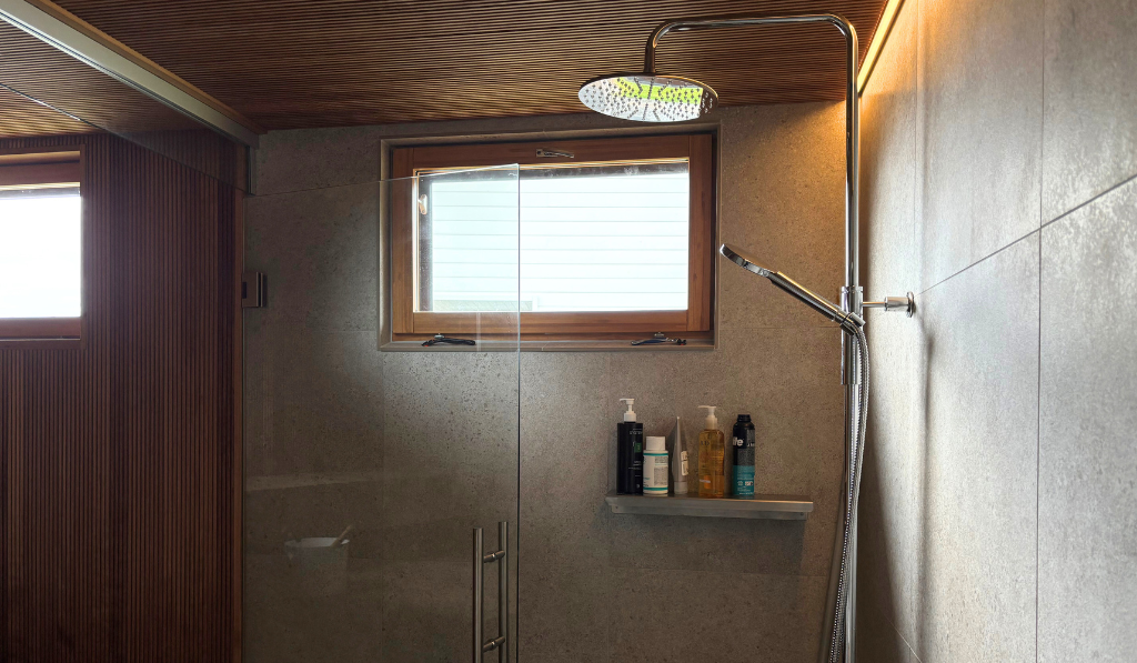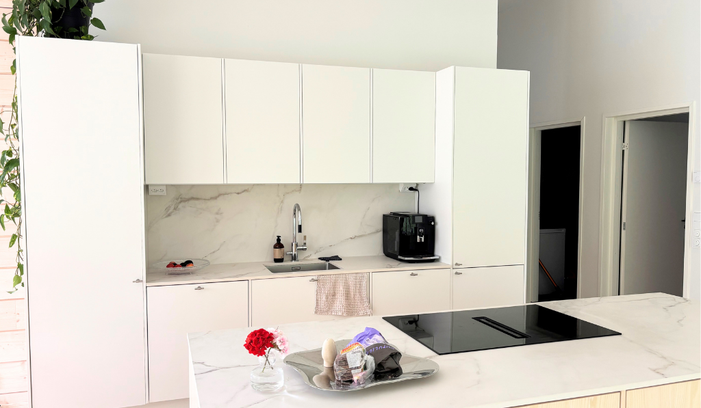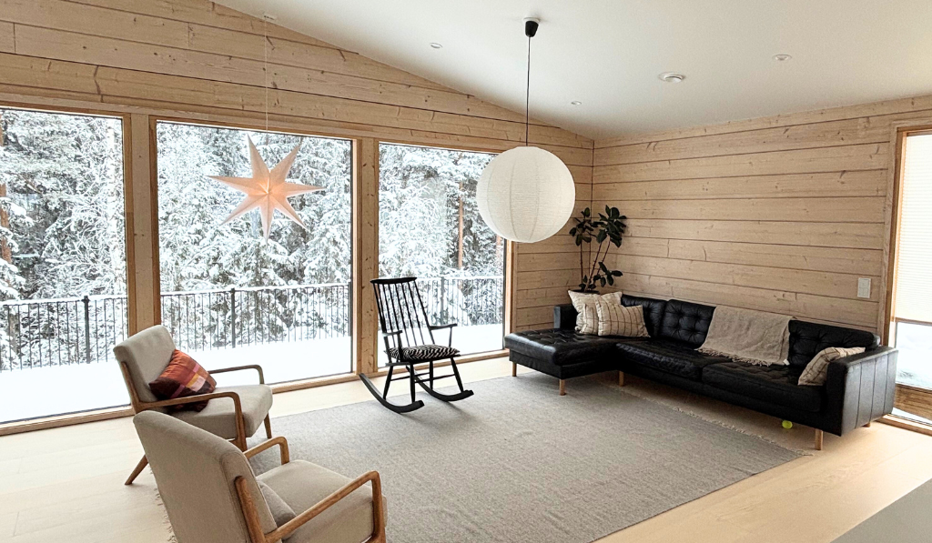 - Tupakeittiö suurilla ikkunoilla, joista avautuu henkeäsalpaava metsänäkymä.